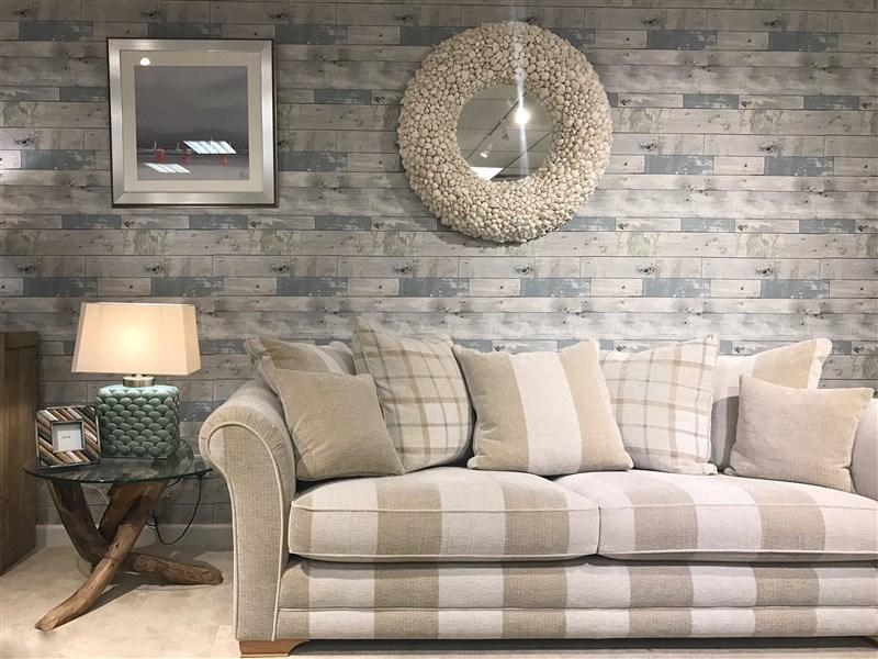 The washed-blue grey panel style wall paper immediately establishes the Coastal theme in this area of our showroom. The weathered look creates a beach-hut vibe which is complemented by the sandy stripes of the Newport Grand Sofa. The Painting and the Shell Mirror bring the look together, whilst the Blue Shell Table Lamp gives the look a pop of colour.