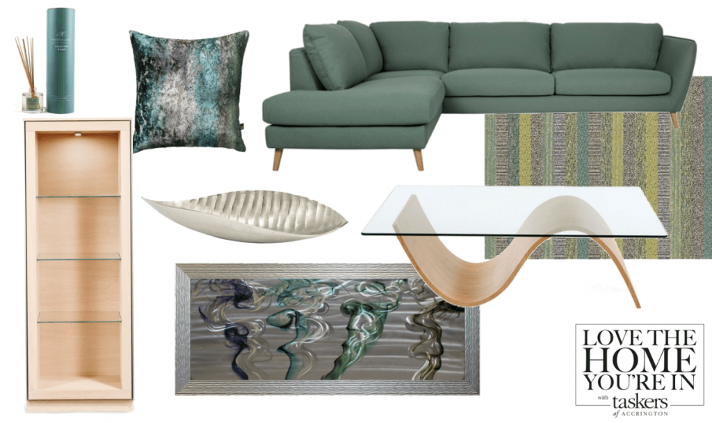 (Featured products: Marmalade of London Lime and Basil Reed Diffuser, Scatter Box Luxor Teal Cushion, Seashell Platter, Smoke Metal Liquid Art, Sits Stella Sofa, Mastercraft Muse Rug and Tom Schneider Pulse Coffee Table.)