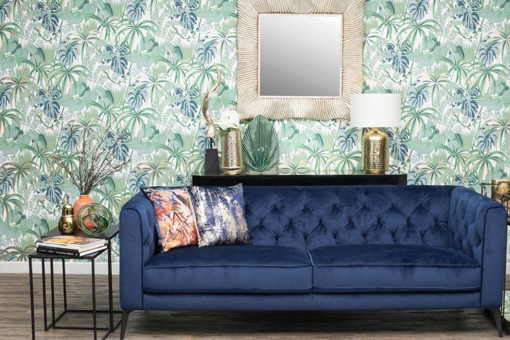 We’ve chosen a bright, adventurous backdrop that contrasts against this sleek and chic sofa design, while gold accent accessories play with light reflection in the most beautiful way.