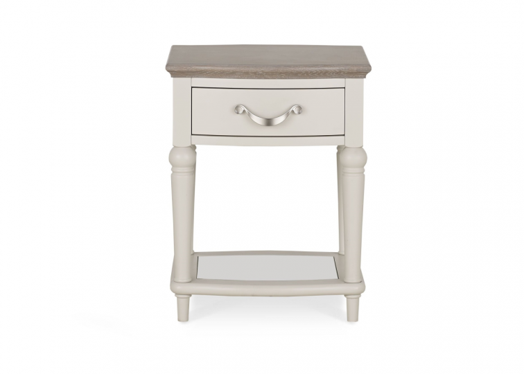This beautifully crafted end table has a smooth, squared top finished in grey washed oak upon a soft-grey painted frame.