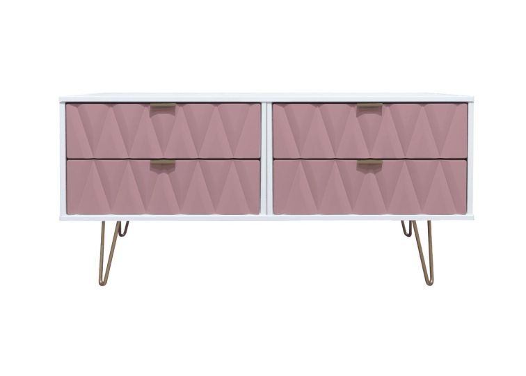 Organise your bedroom in style with the Diamond Kobe Pink Bed box, a handy storage unit with 4 spacious drawers to help you neatly put away clothing or bedding. It’s an instant glamorous statement with an indented diamond pattern on the pink drawer fronts, perfectly complimented by an outer shell in either white or grey. Completing the look of the bed box is slim hairpin legs in contrasting brass.