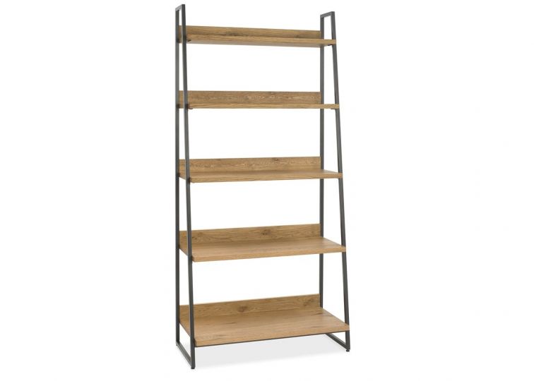 An open shelf display unit with an oak and peppercorn colour palette. The shelves are made from wood with the natural wood grain preserved while the contrasting frame is black powder coated metal, providing a contemporary contrast. All 5 of the supportive shelves have more than enough room for you to store whatever you like from family photos to your favourite books and more.