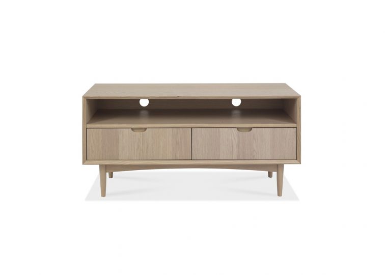 The Sigma Entertainment Unit is a block-shaped storage station with two spacious soft-close drawers and an internal shelf for media boxes.