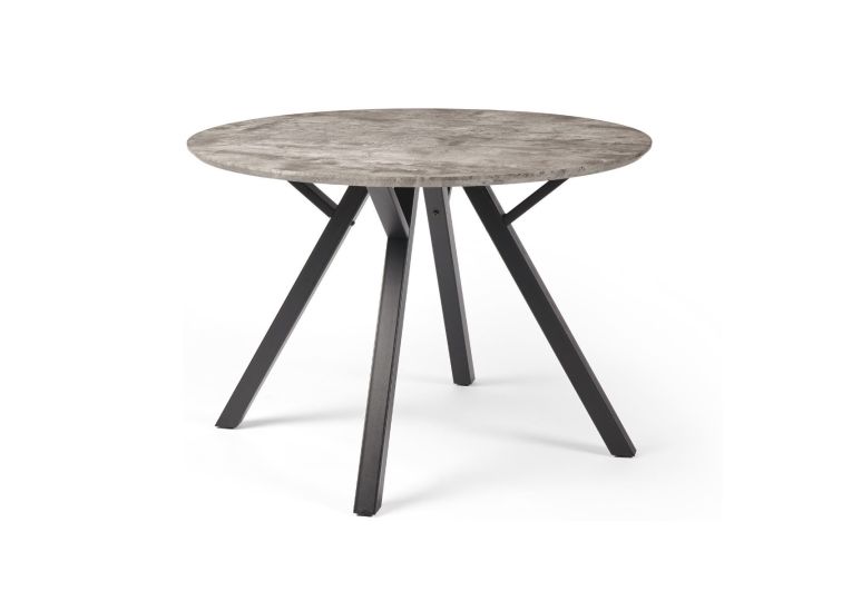 The Vega Round Dining Table has an on-trend industrial-inspired design with a concrete-effect table top and black metal legs.