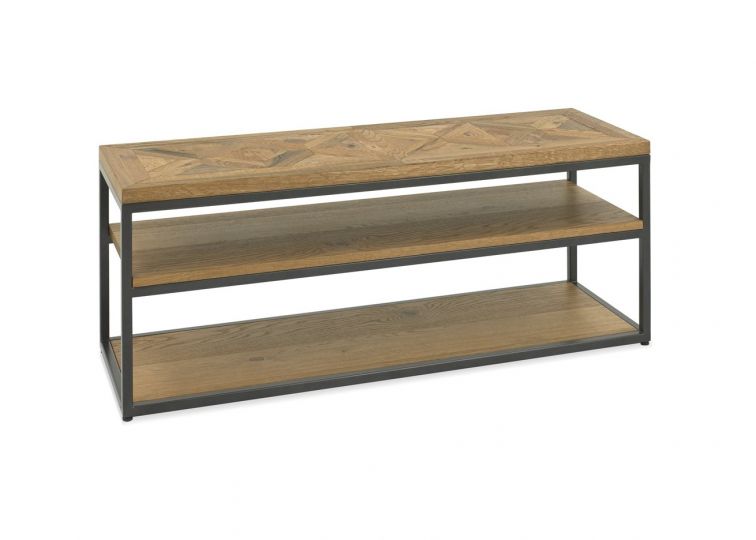 The Bombay Entertainment Unit is a TV stand with an open, ever-flowing design. A trio of light oak shelves can help you store media boxes and a large television, with the whole unit supported by a black powder coated metal frame inspired by industrial interior design. Admire the marquetry tops of the TV unit, which has a beautiful geometric design. One of the many exquisite details featued in the Bombay Living and Dining Collection.