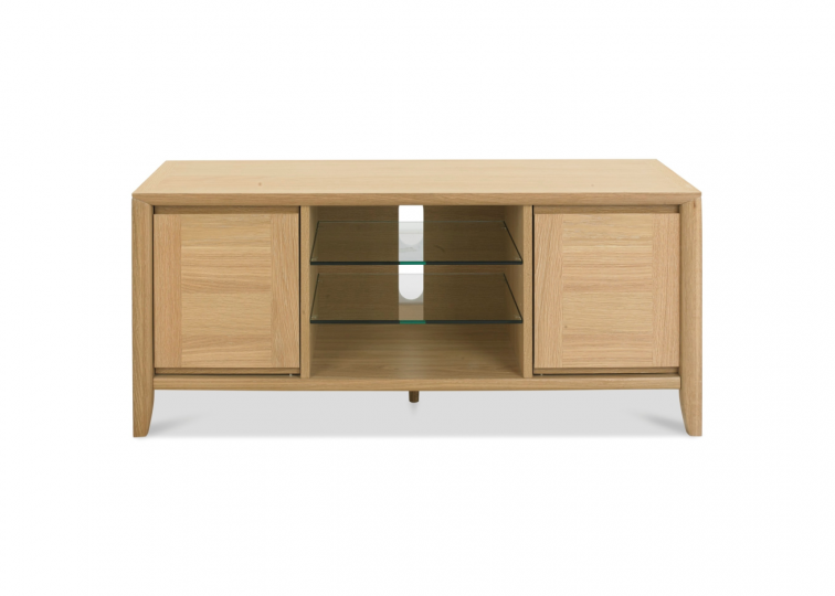 This sleek Oak Entertainment Unit features 2 doors and 2 glass shelves of storage space, which adds a practical feature to the simple yet stylish design. The tapering legs also add a touch of contemporary to the clean lines of the silhouette.