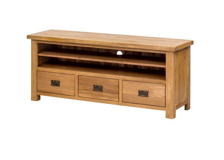 The craftsmanship is traditional yet has all of the functionalities of a modern media unit. You’ll find plenty of storage within the 3 pull-out drawers and an elongated central shelf.