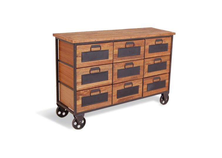 The Re-Engineered 9 Drawer Apothecary Chest has an on-trend industrial inspired design, with its sturdy steel frame and wheels. To contrast the factory-feel of the metal, the mango wood gives the chest some warmth.