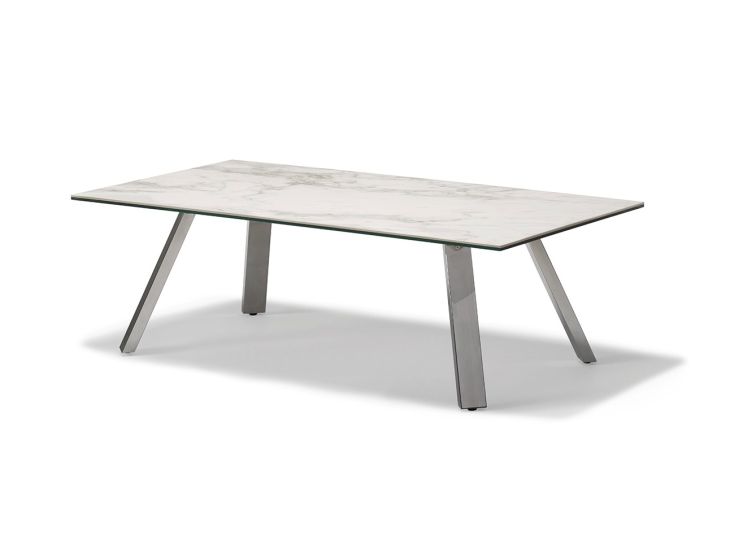 The Kesterport Catania Coffee Table has a beautiful design with a marble effect ceramic top and outwardly angled polished stainless steel legs. The ultra-contemporary design is perfect for a modern living space.