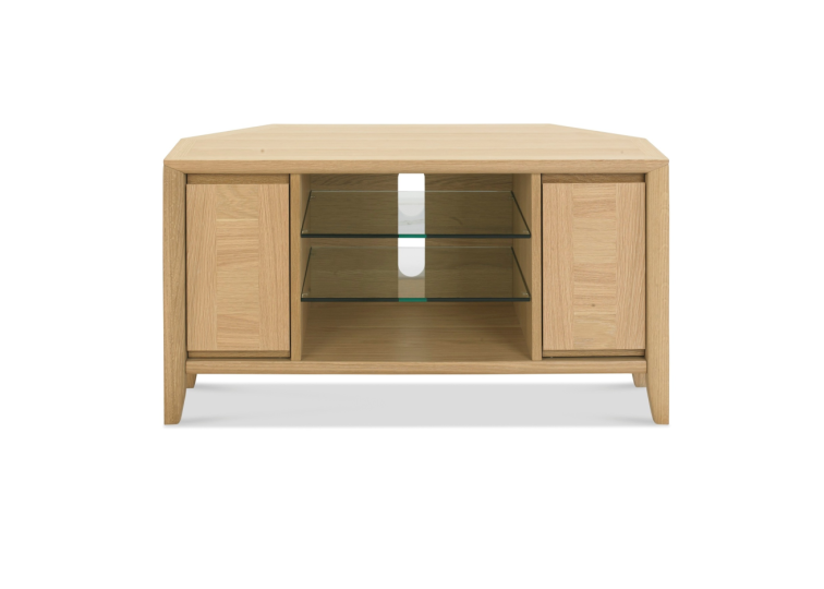 A shapely corner media unit, you can place your TV on the American oak top, while 2 slim, discreet doors of storage are great to place games, DVD’s or even the remotes when not in use.
