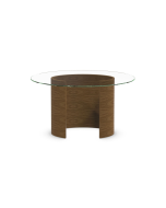 The Tom Schneider Ellipse Medium Coffee Table has a gorgeous design with a striking elliptical shaped wooden base and a sleek glass top. The horizontal grain in the wood flows seamlessly around the base, creating a beautiful effect.
